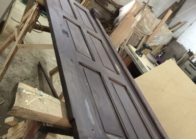 So, after consulting our heritage department officer, who suggested renovating the main doors instead of installing new ones, we called in a talented team of carpenters from Bystrzyca Kłodzka to take the doors for revitalization. They quickly removed our doors and installed something temporary. We’ll also replace the missing piece above the door, which we suspect disappeared after several break-ins. We’ll restore all the elements and give them a second life, so they can continue to serve in their original place. The badly damaged section near the lock will need to be replaced. Mr. Konrad, our carpenter, said the doors are of good quality and are holding up remarkably well for their age.